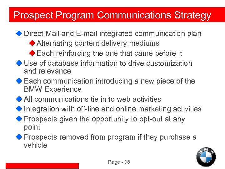 Prospect Program Communications Strategy u Direct Mail and E-mail integrated communication plan u Alternating content delivery mediums u Each reinforcing the one that came before it u Use of database information to drive customization and relevance u Each communication introducing a new piece of the BMW Experience u All communications tie in to web activities u Integration with off-line and online marketing activities u Prospects given the opportunity to opt-out at any point u Prospects removed from program if they purchase a vehicle Page - 38