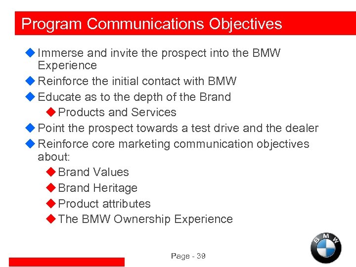 Program Communications Objectives u Immerse and invite the prospect into the BMW Experience u Reinforce the initial contact with BMW u Educate as to the depth of the Brand u Products and Services u Point the prospect towards a test drive and the dealer u Reinforce core marketing communication objectives about: u Brand Values u Brand Heritage u Product attributes u The BMW Ownership Experience Page - 39