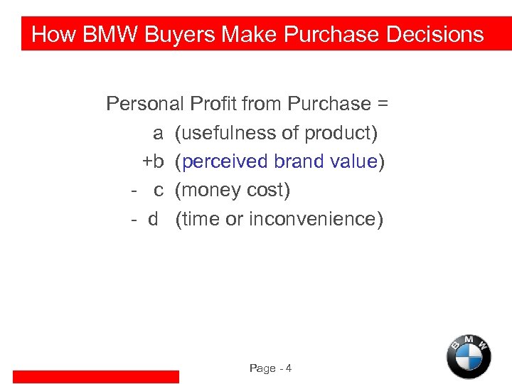How BMW Buyers Make Purchase Decisions Personal Profit from Purchase = a (usefulness of product) +b (perceived brand value) - c (money cost) - d (time or inconvenience) Page - 4