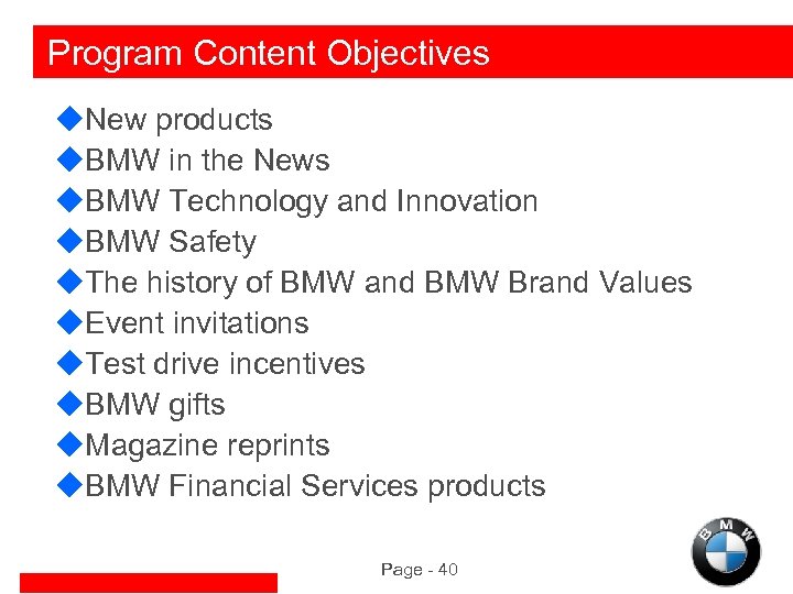 Program Content Objectives u. New products u. BMW in the News u. BMW Technology and Innovation u. BMW Safety u. The history of BMW and BMW Brand Values u. Event invitations u. Test drive incentives u. BMW gifts u. Magazine reprints u. BMW Financial Services products Page - 40