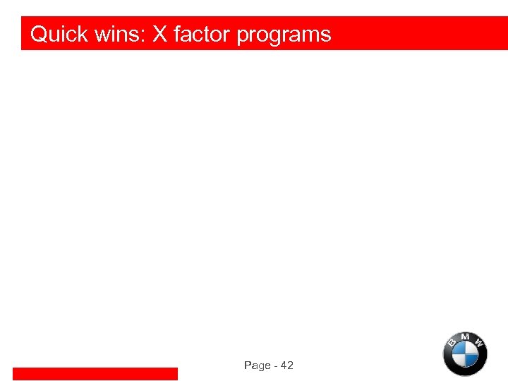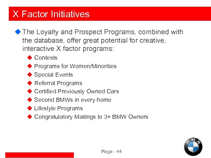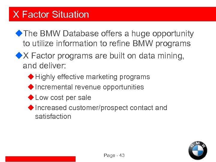 X Factor Situation u. The BMW Database offers a huge opportunity to utilize information to refine BMW programs u. X Factor programs are built on data mining, and deliver: u Highly effective marketing programs u Incremental revenue opportunities u Low cost per sale u Increased customer/prospect contact and satisfaction Page - 43