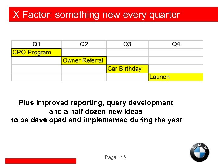 X Factor Initiatives u The Loyalty and Prospect Programs, combined with the database, offer great potential for creative, interactive X factor programs: u u u u Contests Programs for Women/Minorities Special Events Referral Programs Certified Previously Owned Cars Second BMWs in every home Lifestyle Programs Congratulatory Mailings to 3+ BMW Owners Page - 44