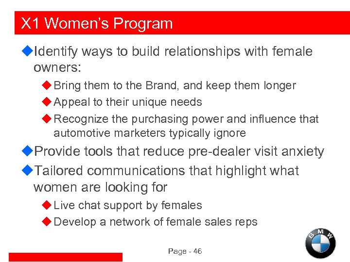 X 1 Women’s Program u. Identify ways to build relationships with female owners: u Bring them to the Brand, and keep them longer u Appeal to their unique needs u Recognize the purchasing power and influence that automotive marketers typically ignore u. Provide tools that reduce pre-dealer visit anxiety u. Tailored communications that highlight what women are looking for u Live chat support by females u Develop a network of female sales reps Page - 46