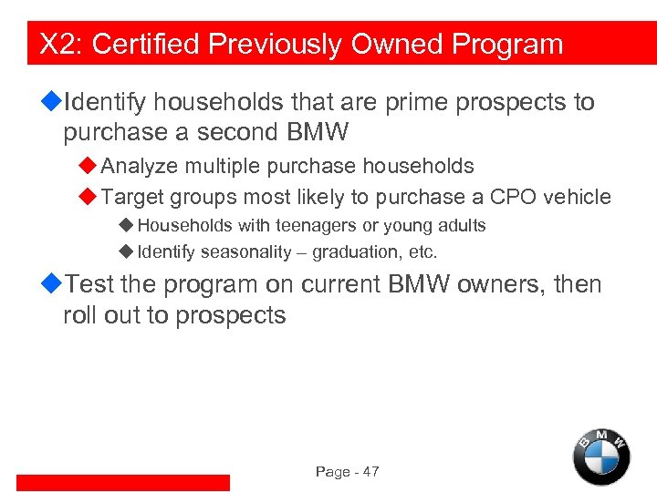 X 2: Certified Previously Owned Program u. Identify households that are prime prospects to purchase a second BMW u Analyze multiple purchase households u Target groups most likely to purchase a CPO vehicle u Households with teenagers or young adults u Identify seasonality – graduation, etc. u. Test the program on current BMW owners, then roll out to prospects Page - 47