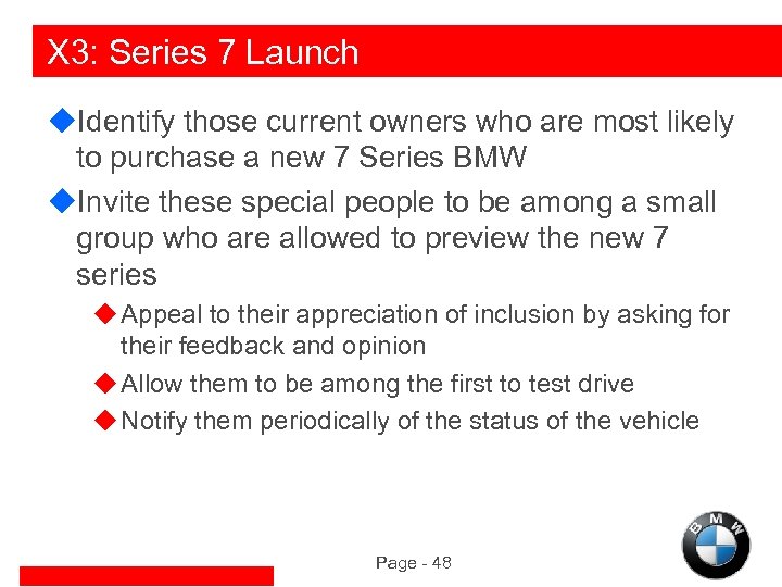 X 3: Series 7 Launch u. Identify those current owners who are most likely to purchase a new 7 Series BMW u. Invite these special people to be among a small group who are allowed to preview the new 7 series u Appeal to their appreciation of inclusion by asking for their feedback and opinion u Allow them to be among the first to test drive u Notify them periodically of the status of the vehicle Page - 48