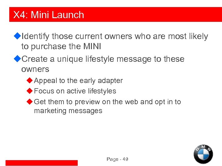 X 4: Mini Launch u. Identify those current owners who are most likely to purchase the MINI u. Create a unique lifestyle message to these owners u Appeal to the early adapter u Focus on active lifestyles u Get them to preview on the web and opt in to marketing messages Page - 49