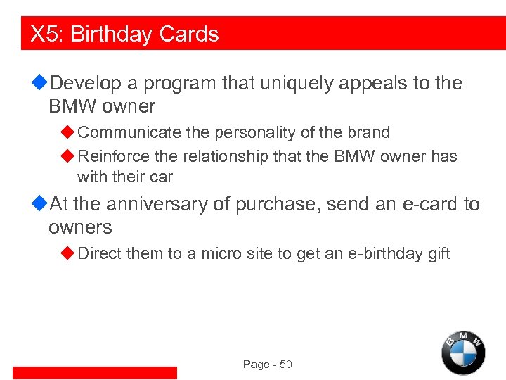 X 5: Birthday Cards u. Develop a program that uniquely appeals to the BMW owner u Communicate the personality of the brand u Reinforce the relationship that the BMW owner has with their car u. At the anniversary of purchase, send an e-card to owners u Direct them to a micro site to get an e-birthday gift Page - 50