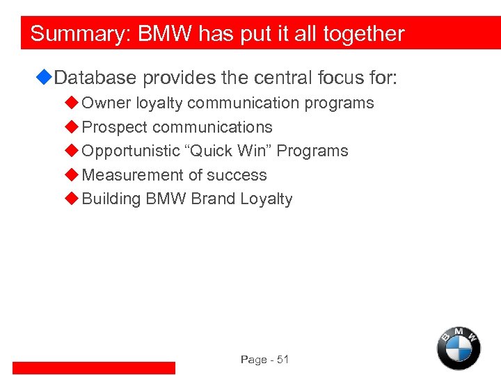 Summary: BMW has put it all together u. Database provides the central focus for: u Owner loyalty communication programs u Prospect communications u Opportunistic “Quick Win” Programs u Measurement of success u Building BMW Brand Loyalty Page - 51