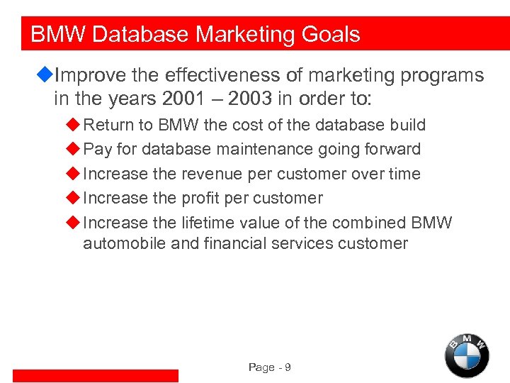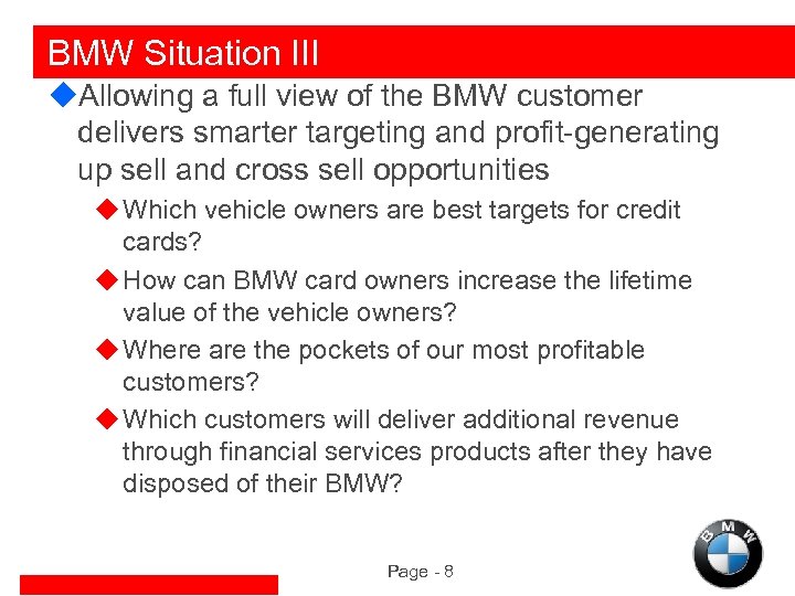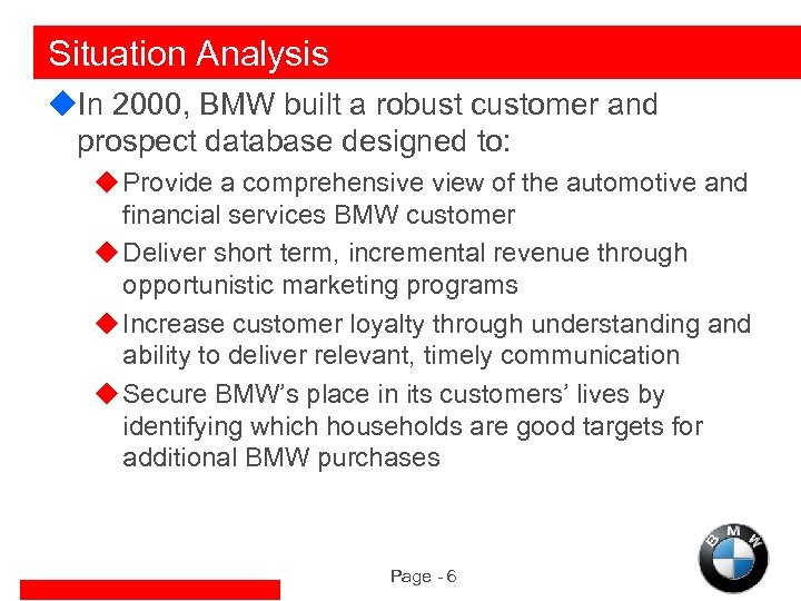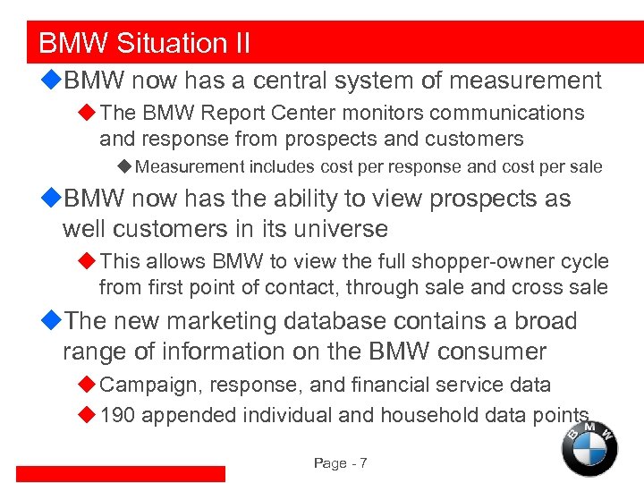 Situation Analysis u. In 2000, BMW built a robust customer and prospect database designed to: u Provide a comprehensive view of the automotive and financial services BMW customer u Deliver short term, incremental revenue through opportunistic marketing programs u Increase customer loyalty through understanding and ability to deliver relevant, timely communication u Secure BMW’s place in its customers’ lives by identifying which households are good targets for additional BMW purchases Page - 6