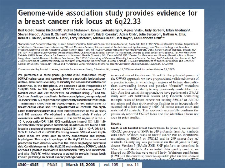 Problems with studies n n Data mining False positives (500 K+ tests) n Use adjusted/tiny p-values n Replication n Linkage disequilibrium n n n Gene-environmental interactions Population Stratification n n Hamer (2002)—markers for chopstick use Gene-gene interactions