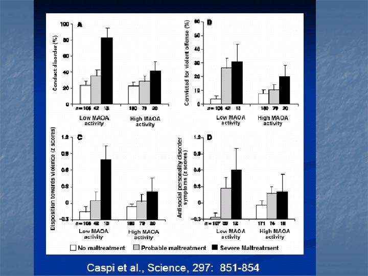 Gene x Environment n Caspi et al. , Science 2002 Why do some maltreated children grow up to develop antisocial behaviors and others do not? n MAOA gene (encodes neurotransmittermetabolizing enzyme) n n n Animal model evidence Found to moderate the effect of childhood maltreatment