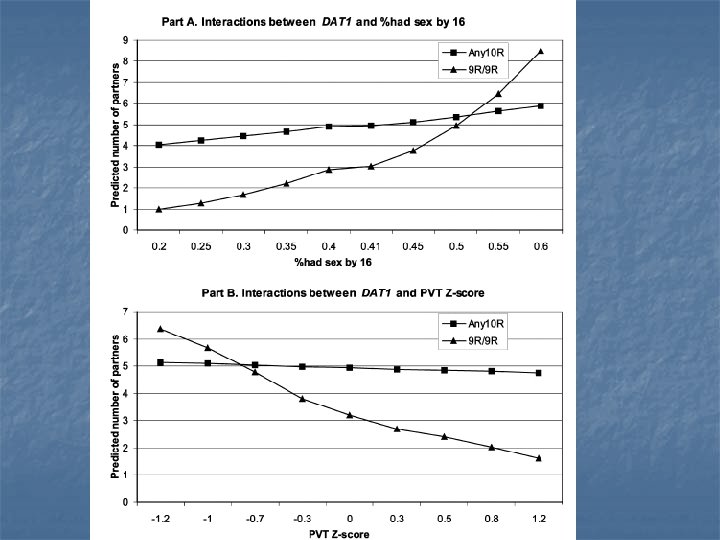 Example: Guo et al. 2008 AJS n n n Outcome: number of sexual partners Gene: DAT (dopamine transporter) Environment: school-level norms: % of kids who have sex early n Cognitive ability n