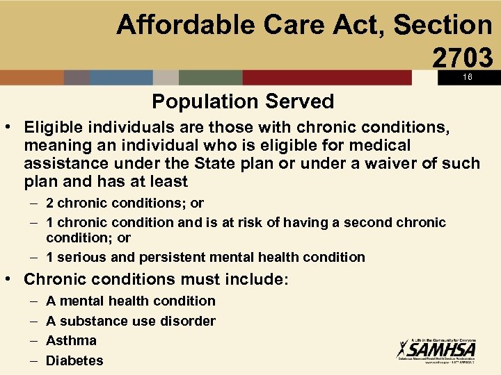 Affordable Care Act, Section 2703 15 “State Option to Provide Health Homes for Enrollees with Chronic Conditions”* Goal: enhanced integration and coordination of primary, acute, behavioral health (mental health and substance use), and long-term services and supports for persons across the lifespan with chronic illness The health home provision provides an opportunity to build a person-centered system of care that achieves improved outcomes for beneficiaries and better services and value for State Medicaid programs *Led by Centers for Medicaid and Medicare (CMS), in partnership with SAMHSA, ASPE, HRSA, and AHRQ