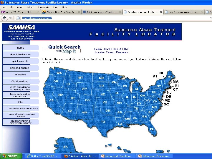 Substance Abuse Treatment Facility Locator 20 • Special Programs/Groups: – Adolescents – Persons with co-occurring mental and substance abuse disorders – Persons with HIV/AIDS – Gays and lesbians – Seniors/older adults – Pregnant/postpartum women – Women/Men – Residential beds for clients' children – DUI/DWI offenders – Criminal justice clients • Forms of Payment Accepted: (NOTE: Check with facility for details. Applicability varies according to individual circumstances. ) – – – Medicaid State financed insurance (other than Medicaid) Medicare Private health insurance Military insurance (e. g. , VA, TRICARE) Self payment