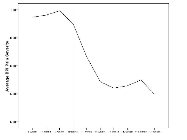 RESULTS 226 patients completed the trial Average was 54; 60% were Medicaid insured and 38% on disability; high baseline levels of pain (mean BPI pain severity 6. 8; mean days with pain, 12. 3 of 14 days ). Mean number of treatments was 8. 0 (SD 4. 7). Reduction in pain severity between baseline and treatment phase was significant (p <. 001). Improvements in physical well-being were significant at 12 and 24 weeks post-baseline (p <. 001). 30. 3% experienced a 30% or greater improvement in pain—the generally accepted threshold for clinically significant change.