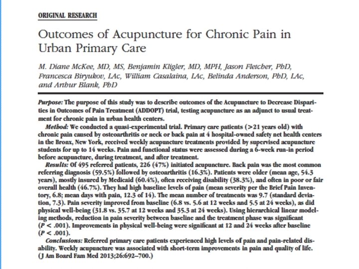 METHODS Population: primary care patients (>18 years) with chronic pain due to osteoarthritis, neck or back pain at four hospital owned safety net community health centers in the Bronx NY. The patient population was ethnically diverse and low income in a medically underserved area of the Bronx. Intervention: weekly acupuncture treatments for up to 14 weeks. The acupuncture team was free to adapt and change the treatment approach from week to week based on the condition of the patient and response to treatment.