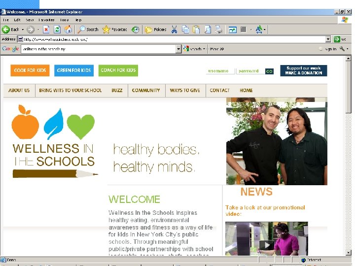WELLNESS IN THE SCHOOLS $167 billion per year on obesity-related illness 43% of children in NY are obese 30, 000 kids in 36 under-resourced schools Cook for Kids: uses culinary interns to bring fresh and health food to schools Coach for Kids: stations coaches in recess yards to encourage physical activity Green for Kids: environmentally safe cleaning products for schools