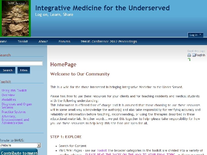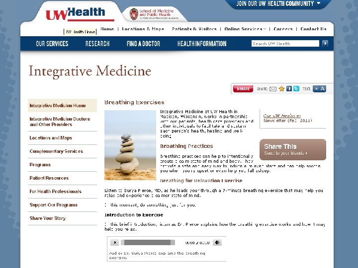 RESOURCES: TEACHING MATERIALS http: //uwhealth. org/alternative- medicine/breathing-exercises/30408 http: //fammed. wisc. edu/integrative/mod ules Integrative Medicine for the Underserved http: //im 4 us. org/Home. Page Clinicians’ and Educators’ Desk Reference on the Licensed Complementary and Alternative Healthcare Professions http: //accahc. org/cedr