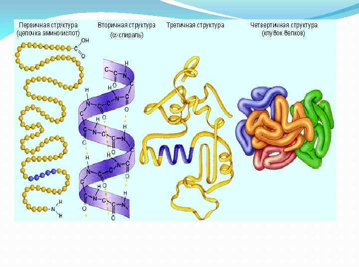 Просторова структура білків. (Розповідь вчителя із розглядом мал. «Просторова конфігурація білків» ) Первинна. Послідовне, лінійне сполучення залишків амінокислот за допомогою пептидних зв'язків. Вторинна. (Досліджували американські вчені Л. Полінг та Р. Корі). Спіраль з водневими зв'язками. Третинна. (Досліджував англійський вче ний Дж. Кендрю в 1957 р. ). Клубок спіралі; зв'язки водневі, гідрофобні, іонні. Четвертинна Пачки молекул — декілька спіралей.