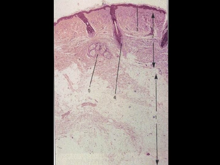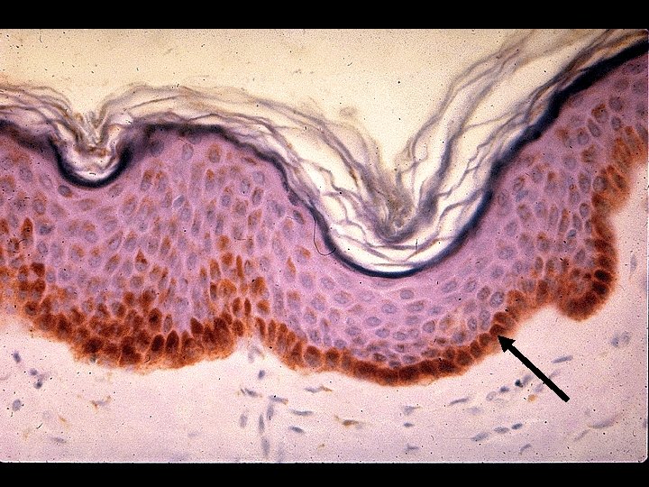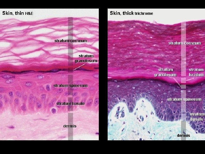 Epidermis • Tough, leathery outer surface • Composed mainly of Keratinocytes • . 06 -. 6 mm, thickest portion palms and soles • Epidermis avascular, receives nutrients by diffusion through semi-permeable Basement Membrane (BM)