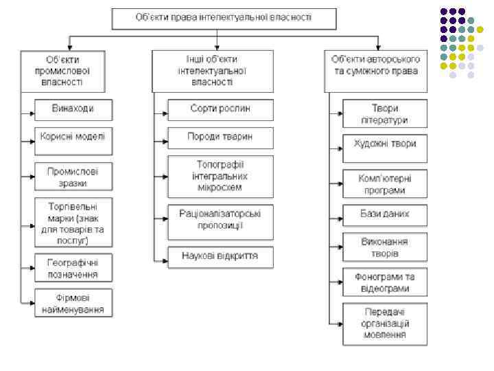 До інтелектуальної власності належать права на: l l l l літературні, художні та наукові твори; виконавчу діяльність артистів, звукозапис, радіо- і телевізійні передачі; винаходи у сферах людської діяльності; наукові відкриття; промислові зразки, товарні знаки, знаки обслуговування, фірмові найменування і комерційні позначення; захист від недобросовісної конкуренції; усі інші права, що належать до інтелектуальної діяльності у виробничій, науковій, літературній і художній сферах.