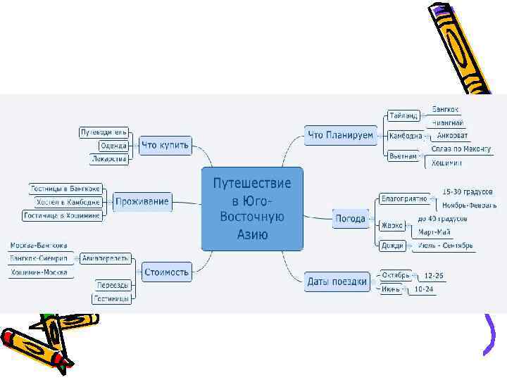 Для большей наглядности вы можете применять: 1. Разные цвета у ветвей карты. 2. Разный шрифт и его величину в зависимости от важности ветви. 3. Добавлять к ассоциациям картинки - это усилит эффект карты за счет визуального запоминания.