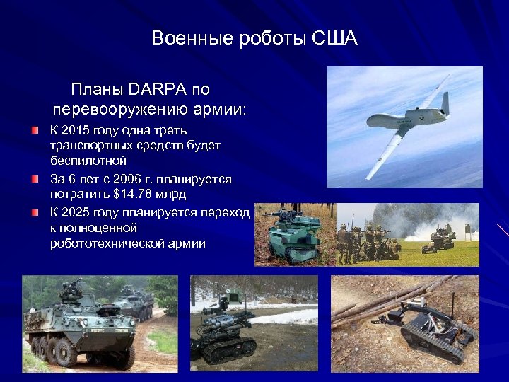 Военные роботы США Планы DARPA по перевооружению армии: К 2015 году одна треть транспортных средств будет беспилотной За 6 лет с 2006 г. планируется потратить $14. 78 млрд К 2025 году планируется переход к полноценной робототехнической армии