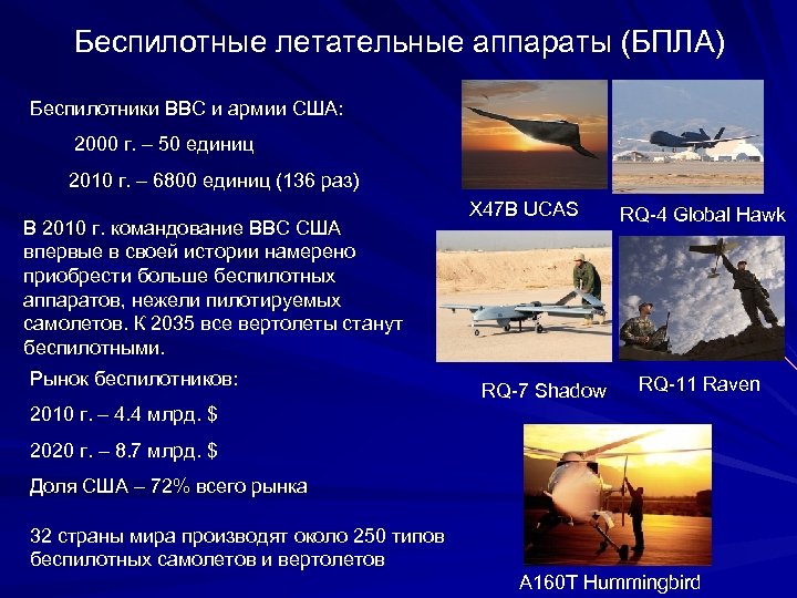 Беспилотные летательные аппараты (БПЛА) Беспилотники ВВС и армии США: 2000 г. – 50 единиц 2010 г. – 6800 единиц (136 раз) В 2010 г. командование ВВС США впервые в своей истории намерено приобрести больше беспилотных аппаратов, нежели пилотируемых самолетов. К 2035 все вертолеты станут беспилотными. Рынок беспилотников: X 47 B UCAS RQ-7 Shadow RQ-4 Global Hawk RQ-11 Raven 2010 г. – 4. 4 млрд. $ 2020 г. – 8. 7 млрд. $ Доля США – 72% всего рынка 32 страны мира производят около 250 типов беспилотных самолетов и вертолетов A 160 T Hummingbird