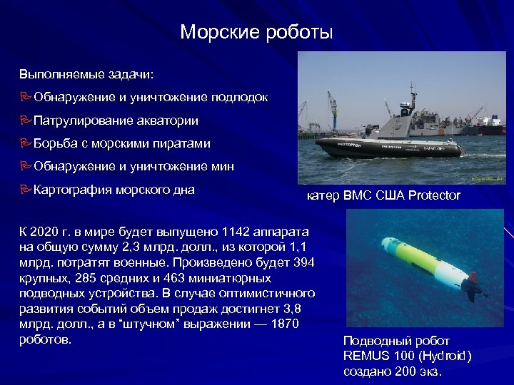 Морские роботы Выполняемые задачи: PОбнаружение и уничтожение подлодок PПатрулирование акватории PБорьба с морскими пиратами PОбнаружение и уничтожение мин PКартография морского дна катер ВМС США Protector К 2020 г. в мире будет выпущено 1142 аппарата на общую сумму 2, 3 млрд. долл. , из которой 1, 1 млрд. потратят военные. Произведено будет 394 крупных, 285 средних и 463 миниатюрных подводных устройства. В случае оптимистичного развития событий объем продаж достигнет 3, 8 млрд. долл. , а в “штучном” выражении — 1870 роботов. Подводный робот REMUS 100 (Hydroid) создано 200 экз.