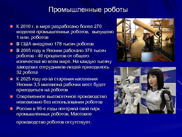 Промышленные роботы К 2010 г. в мире разработано более 270 моделей промышленных роботов, выпущено 1 млн. роботов В США внедрено 178 тысяч роботов В 2005 году в Японии работало 370 тысяч роботов - 40 процентов от общего количества во всем мире. На каждую тысячу заводских сотрудников-людей приходилось 32 робота К 2025 году из-за старения населения Японии 3, 5 миллиона рабочих мест будет приходиться на роботов Современное высокоточное производство невозможно без использования роботов Россия в 90 -е годы потеряла свой парк промышленных роботов. Массовое производство роботов отсутствует.