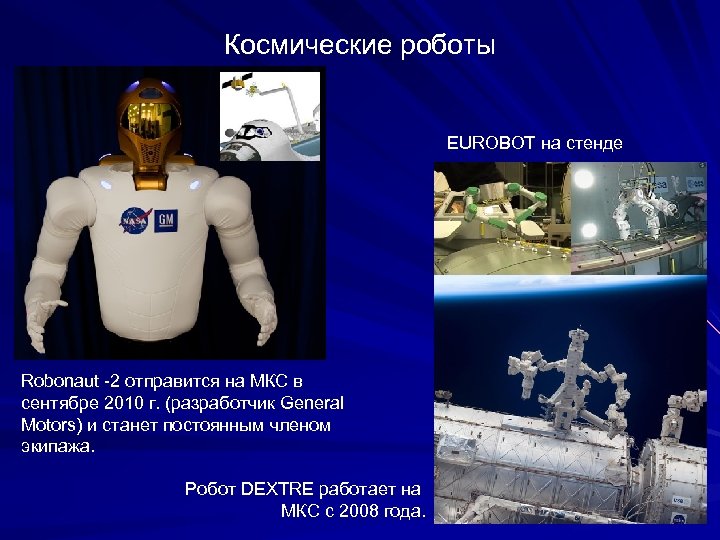 Космические роботы EUROBOT на стенде Robonaut -2 отправится на МКС в сентябре 2010 г. (разработчик General Motors) и станет постоянным членом экипажа. Робот DEXTRE работает на МКС с 2008 года.