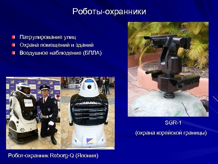 Роботы-охранники Патрулирование улиц Охрана помещений и зданий Воздушное наблюдение (БПЛА) SGR-1 (охрана корейской границы) Робот-охранник Reborg-Q (Япония)