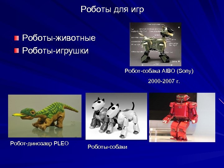 Роботы для игр Роботы-животные Роботы-игрушки Робот-собака AIBO (Sony) 2000 -2007 г. Робот-динозавр PLEO Роботы-собаки
