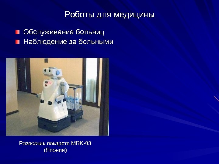 Роботы для медицины Обслуживание больниц Наблюдение за больными Развозчик лекарств MRK-03 (Япония)