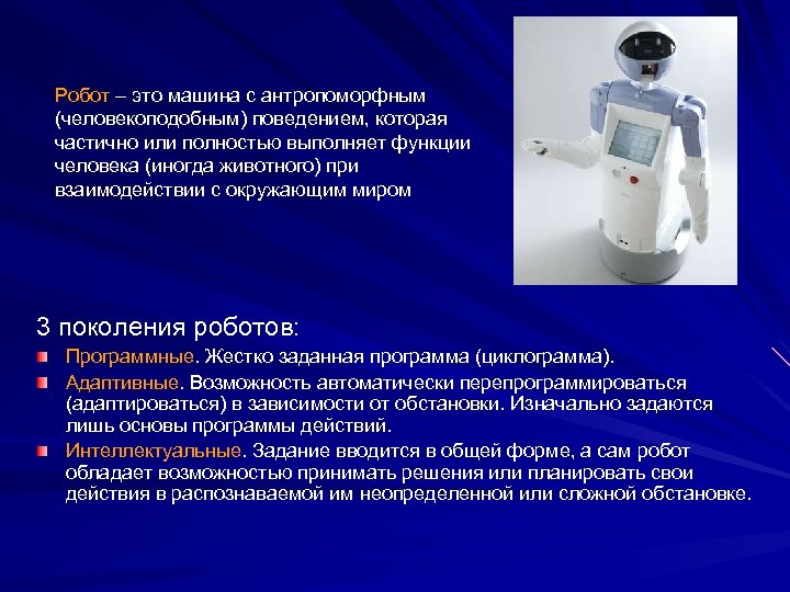 Робот – это машина с антропоморфным (человекоподобным) поведением, которая частично или полностью выполняет функции человека (иногда животного) при взаимодействии с окружающим миром 3 поколения роботов: Программные. Жестко заданная программа (циклограмма). Адаптивные. Возможность автоматически перепрограммироваться (адаптироваться) в зависимости от обстановки. Изначально задаются лишь основы программы действий. Интеллектуальные. Задание вводится в общей форме, а сам робот обладает возможностью принимать решения или планировать свои действия в распознаваемой им неопределенной или сложной обстановке.