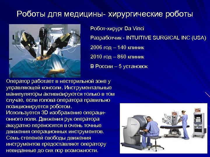Роботы для медицины- xирургические роботы Робот-хирург Da Vinci Разработчик - INTUITIVE SURGICAL INC (USA) 2006 год – 140 клиник 2010 год – 860 клиник В России – 5 установок Оператор работает в нестерильной зоне у управляющей консоли. Инструментальные манипуляторы активизируются только в том случае, если голова оператора правильно позиционируется роботом. Используется 3 D изображение операционного поля. Движения рук оператора аккуратно переносятся в очень точные движения операционных инструментов. Семь степеней свободы движения инструментов предоставляют оператору невиданные до сих пор возможности.