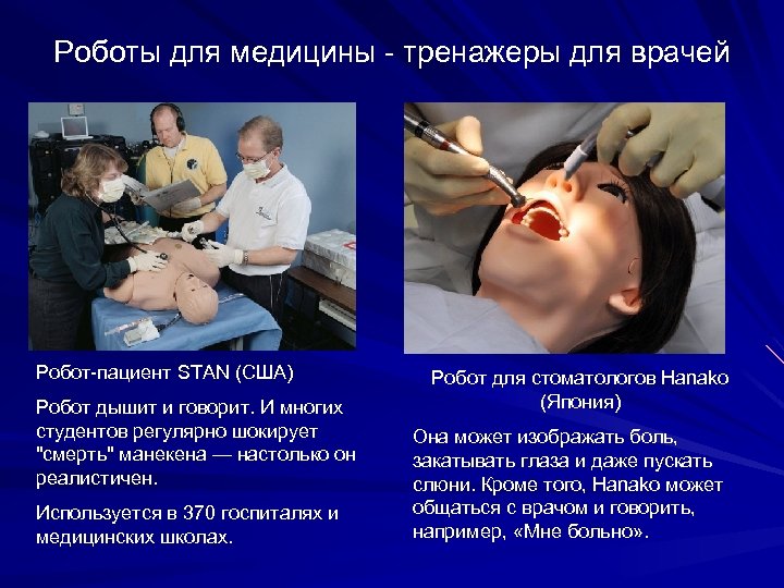 Роботы для медицины - тренажеры для врачей Робот-пациент STAN (США) Робот дышит и говорит. И многих студентов регулярно шокирует "смерть" манекена — настолько он реалистичен. Используется в 370 госпиталях и медицинских школах. Робот для стоматологов Hanako (Япония) Она может изображать боль, закатывать глаза и даже пускать слюни. Кроме того, Hanako может общаться с врачом и говорить, например, «Мне больно» .