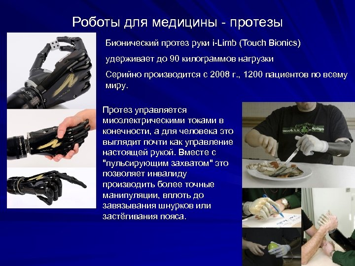 Роботы для медицины - протезы Бионический протез руки i-Limb (Touch Bionics) удерживает до 90 килограммов нагрузки Серийно производится с 2008 г. , 1200 пациентов по всему миру. Протез управляется миоэлектрическими токами в конечности, а для человека это выглядит почти как управление настоящей рукой. Вместе с "пульсирующим захватом" это позволяет инвалиду производить более точные манипуляции, вплоть до завязывания шнурков или застёгивания пояса.