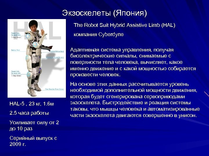 Экзоскелеты (Япония) The Robot Suit Hybrid Assistive Limb (HAL) компания Cyberdyne Адаптивная система управления, получая биоэлектрические сигналы, снимаемые с поверхности тела человека, вычисляет, какое именно движение и с какой мощностью собирается произвести человек. HAL-5 , 23 кг, 1. 6 м 2. 5 часа работы Усиливает силу от 2 до 10 раз Серийный выпуск с 2009 г. На основе этих данных рассчитывается уровень необходимой дополнительной мощности движения, которая будет сгенерирована сервоприводами экзоскелета. Быстродействие и реакция системы таковы, что мышцы человека и автоматизированные части экзоскелета двигаются совершенно в унисон.