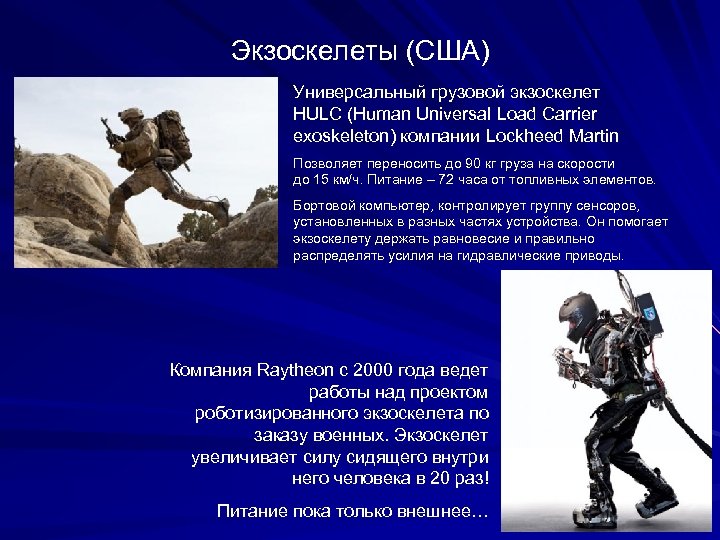 Экзоскелеты (США) Универсальный грузовой экзоскелет HULC (Human Universal Load Carrier exoskeleton) компании Lockheed Martin Позволяет переносить до 90 кг груза на скорости до 15 км/ч. Питание – 72 часа от топливных элементов. Бортовой компьютер, контролирует группу сенсоров, установленных в разных частях устройства. Он помогает экзоскелету держать равновесие и правильно распределять усилия на гидравлические приводы. Компания Raytheon с 2000 года ведет работы над проектом роботизированного экзоскелета по заказу военных. Экзоскелет увеличивает силу сидящего внутри него человека в 20 раз! Питание пока только внешнее…