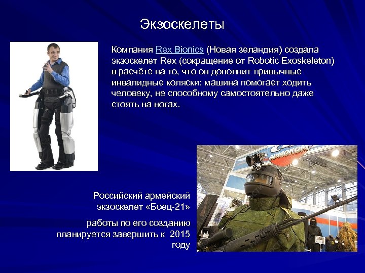 Экзоскелеты Компания Rex Bionics (Новая зеландия) создала экзоскелет Rex (сокращение от Robotic Exoskeleton) в расчёте на то, что он дополнит привычные инвалидные коляски: машина помогает ходить человеку, не способному самостоятельно даже стоять на ногах. Российский армейский экзоскелет «Боец-21» работы по его созданию планируется завершить к 2015 году