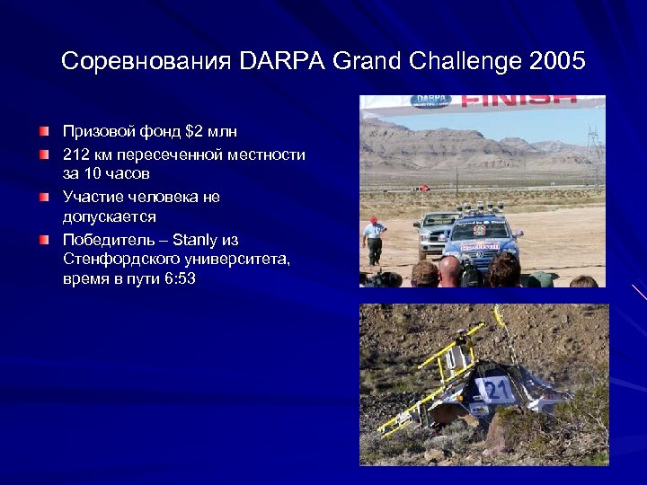 Соревнования DARPA Grand Challenge 2005 Призовой фонд $2 млн 212 км пересеченной местности за 10 часов Участие человека не допускается Победитель – Stanly из Стенфордского университета, время в пути 6: 53