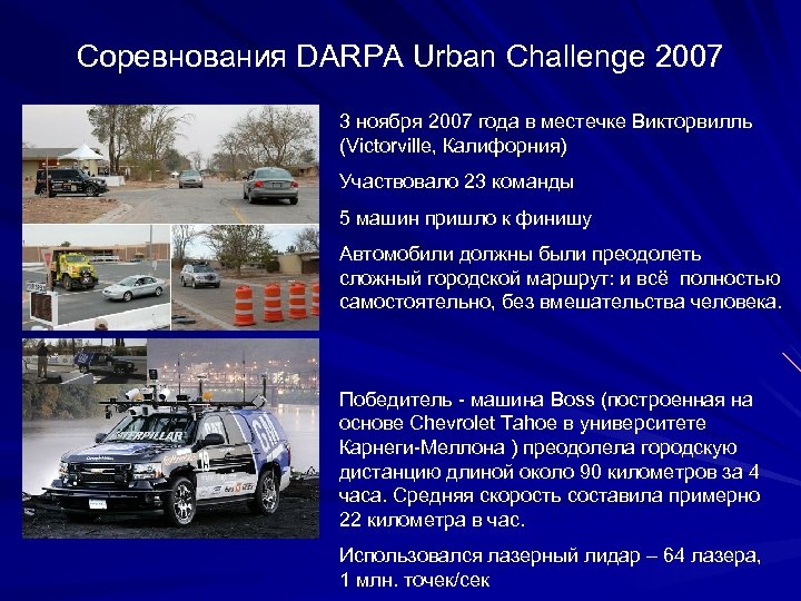 Соревнования DARPA Urban Challenge 2007 3 ноября 2007 года в местечке Викторвилль (Victorville, Калифорния) Участвовало 23 команды 5 машин пришло к финишу Автомобили должны были преодолеть сложный городской маршрут: и всё полностью самостоятельно, без вмешательства человека. Победитель - машина Boss (построенная на основе Chevrolet Tahoe в университете Карнеги-Меллона ) преодолела городскую дистанцию длиной около 90 километров за 4 часа. Средняя скорость составила примерно 22 километра в час. Использовался лазерный лидар – 64 лазера, 1 млн. точек/сек