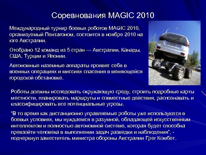 Соревнования MAGIC 2010 Международный турнир боевых роботов MAGIC 2010, организуемый Пентагоном, состоится в ноябре 2010 на юге Австралии. Отобрано 12 команд из 5 стран — Австралии, Канады, США, Турции и Японии. Автономные наземные аппараты проявят себя в военных операциях и миссиях спасения в меняющейся городской обстановке. Роботы должны исследовать окружающую среду, строить подробные карты местности, планировать маршруты и совместные действия, распознавать и классифицировать все потенциальные угрозы. “В то время как дистанционно управляемые роботы уже используются в боевых условиях, мы нуждаемся в разумной, обладающей искусственным интеллектом и полностью автономной системе, которая будет способна превзойти человека в выполнении задач разведки и наблюдения”, - подчеркнул заместитель министра обороны Австралии Грег Комбет.