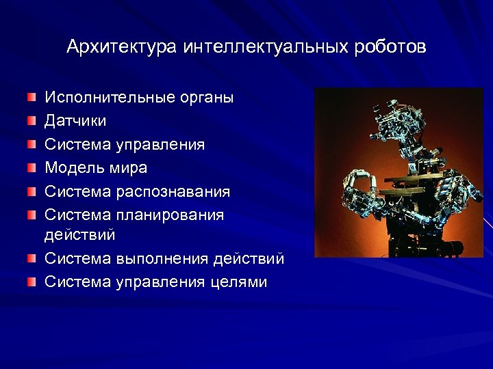 Архитектура интеллектуальных роботов Исполнительные органы Датчики Система управления Модель мира Система распознавания Система планирования действий Система выполнения действий Система управления целями