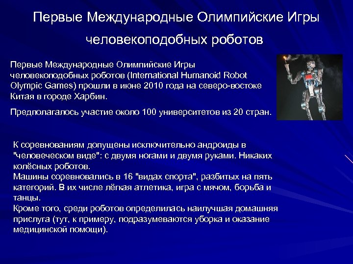 Первые Международные Олимпийские Игры человекоподобных роботов (International Humanoid Robot Olympic Games) прошли в июне 2010 года на северо-востоке Китая в городе Харбин. Предполагалось участие около 100 университетов из 20 стран. К соревнованиям допущены исключительно андроиды в "человеческом виде": с двумя ногами и двумя руками. Никаких колёсных роботов. Машины соревновались в 16 "видах спорта", разбитых на пять категорий. В их числе лёгкая атлетика, игра с мячом, борьба и танцы. Кроме того, среди роботов определилась наилучшая домашняя прислуга (тут, к примеру, подразумеваются уборка и оказание медицинской помощи).