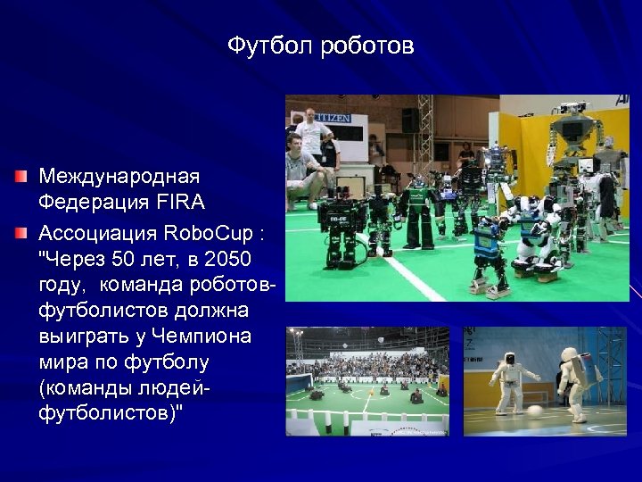 Футбол роботов Международная Федерация FIRA Ассоциация Robo. Cup : "Через 50 лет, в 2050 году, команда роботовфутболистов должна выиграть у Чемпиона мира по футболу (команды людейфутболистов)"