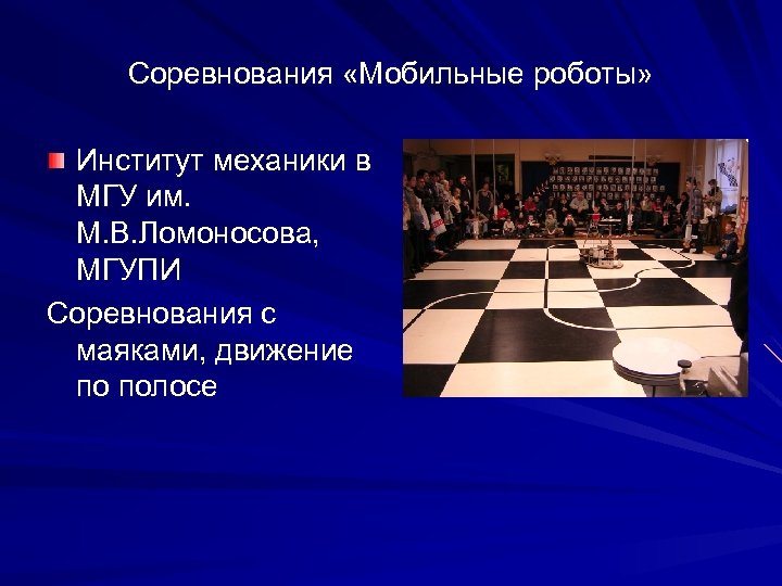Соревнования «Мобильные роботы» Институт механики в МГУ им. М. В. Ломоносова, МГУПИ Соревнования с маяками, движение по полосе