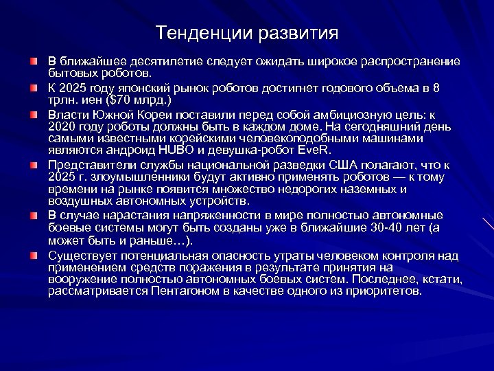 Тенденции развития В ближайшее десятилетие следует ожидать широкое распространение бытовых роботов. К 2025 году японский рынок роботов достигнет годового объема в 8 трлн. иен ($70 млрд. ) Власти Южной Кореи поставили перед собой амбициозную цель: к 2020 году роботы должны быть в каждом доме. На сегодняшний день самыми известными корейскими человекоподобными машинами являются андроид HUBO и девушка-робот Eve. R. Представители службы национальной разведки США полагают, что к 2025 г. злоумышленники будут активно применять роботов — к тому времени на рынке появится множество недорогих наземных и воздушных автономных устройств. В случае нарастания напряженности в мире полностью автономные боевые системы могут быть созданы уже в ближайшие 30 -40 лет (а может быть и раньше…). Существует потенциальная опасность утраты человеком контроля над применением средств поражения в результате принятия на вооружение полностью автономных боевых систем. Последнее, кстати, рассматривается Пентагоном в качестве одного из приоритетов.