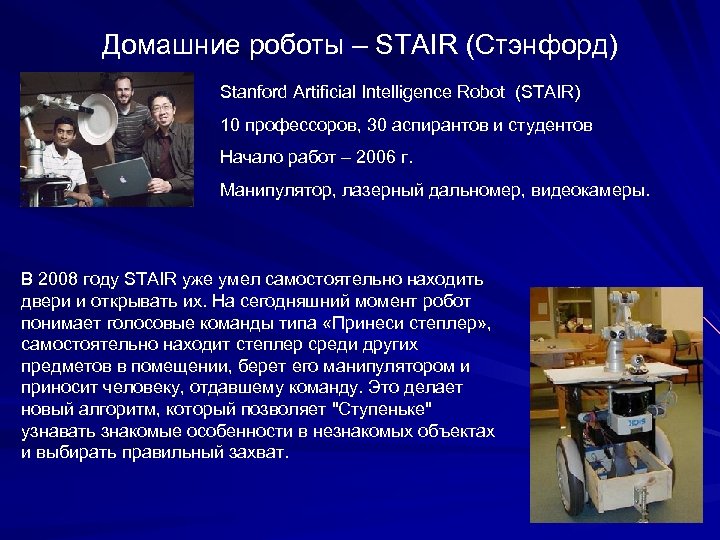 Домашние роботы – STAIR (Стэнфорд) Stanford Artificial Intelligence Robot (STAIR) 10 профессоров, 30 аспирантов и студентов Начало работ – 2006 г. Манипулятор, лазерный дальномер, видеокамеры. В 2008 году STAIR уже умел самостоятельно находить двери и открывать их. На сегодняшний момент робот понимает голосовые команды типа «Принеси степлер» , самостоятельно находит степлер среди других предметов в помещении, берет его манипулятором и приносит человеку, отдавшему команду. Это делает новый алгоритм, который позволяет "Ступеньке" узнавать знакомые особенности в незнакомых объектах и выбирать правильный захват.